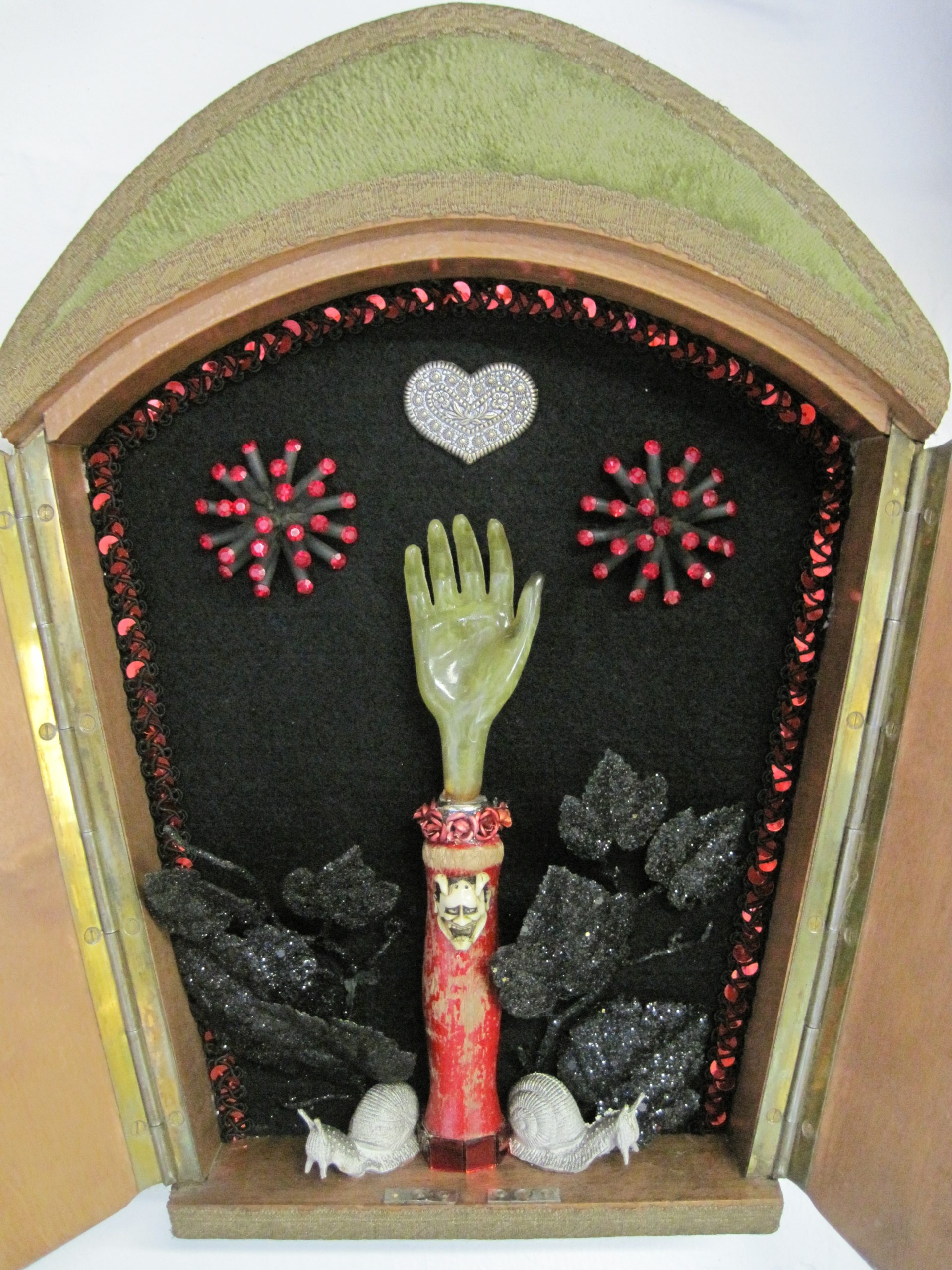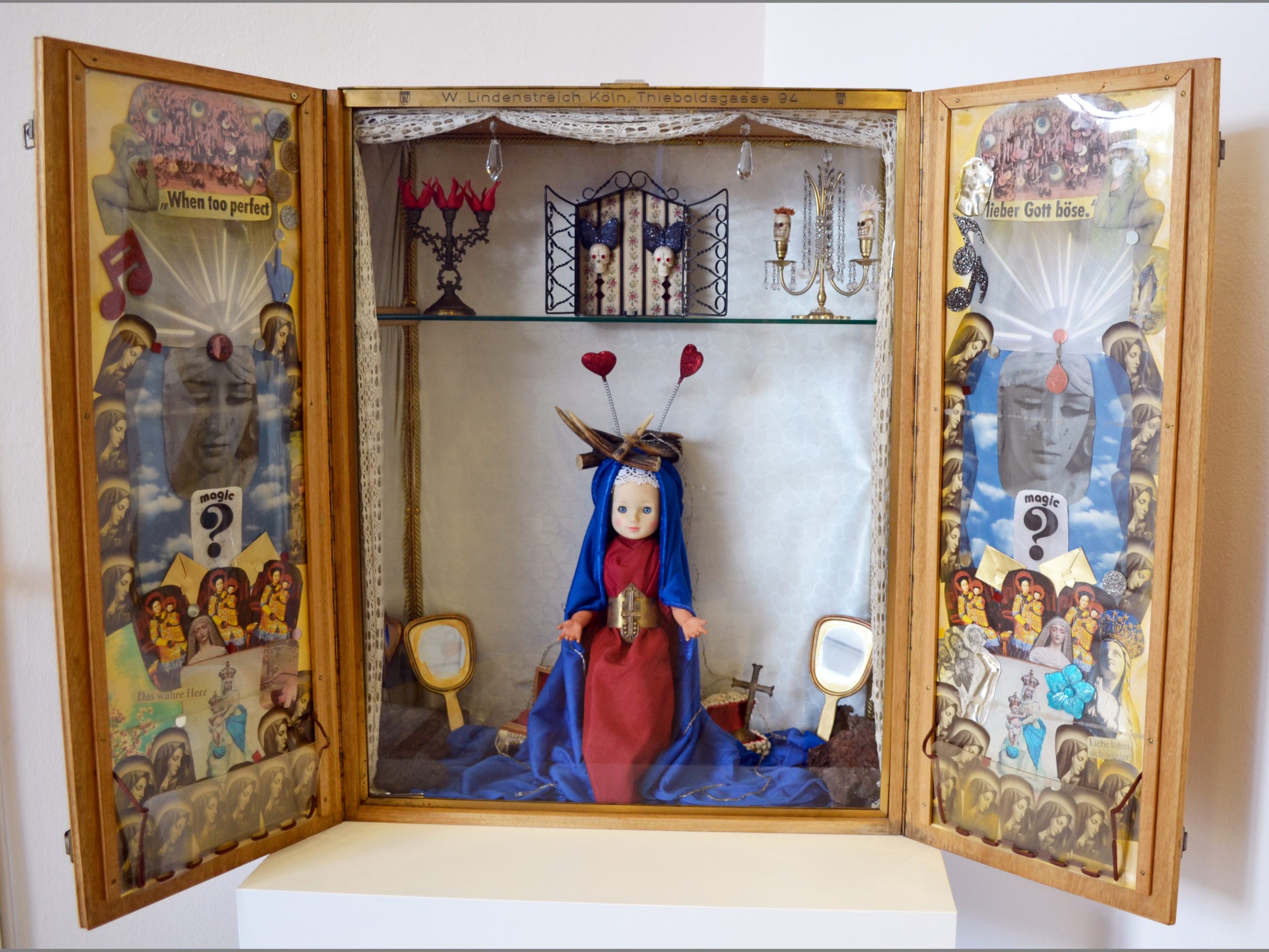 Schreine und Klosterarbeiten haben in allen Kulturen eine große mystische Ausstrahlung. Manche Werke stellen einen Bezug zu sakralem Brauchtum her, handeln vom Geheimnis von Leben und Tod. So erhält Religiöse Dingwelt eine neue Aussagekraft, die weit über den christlichen Bereich hinausgreift.