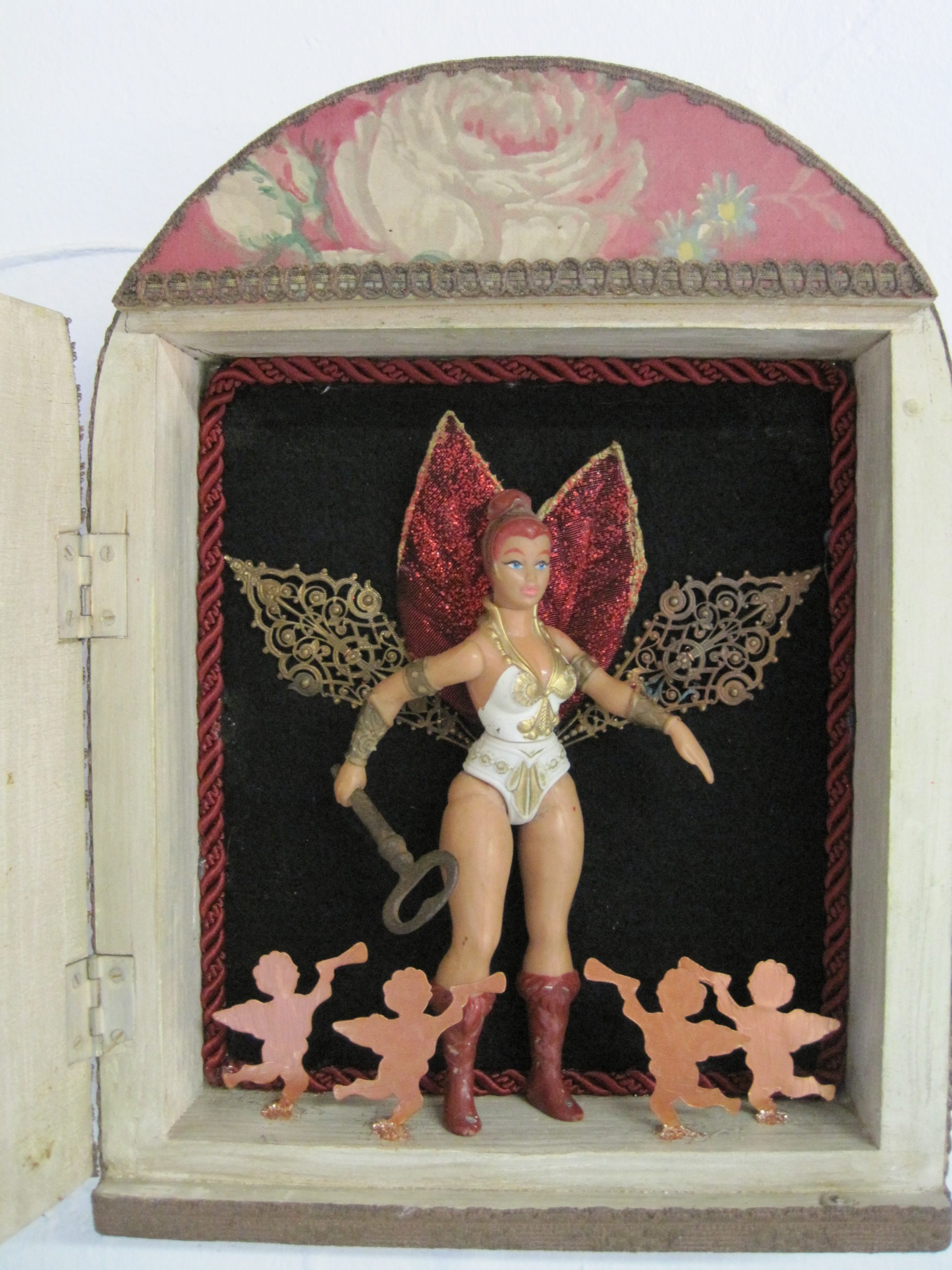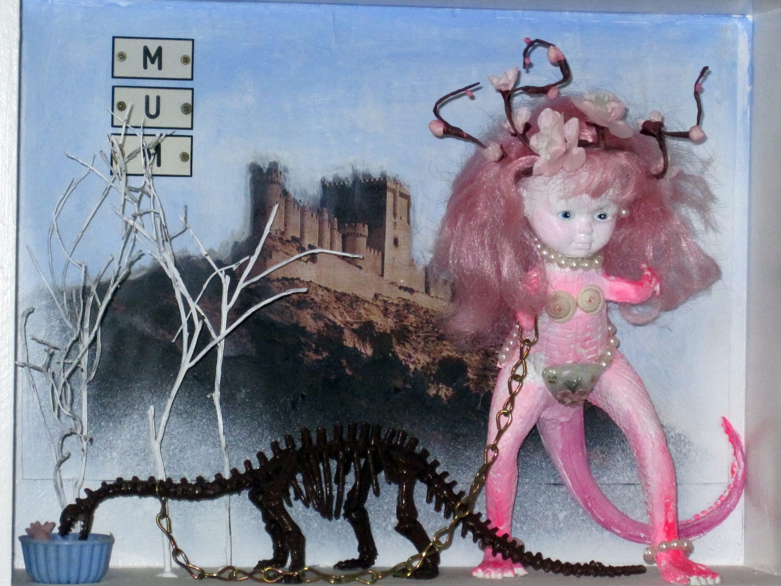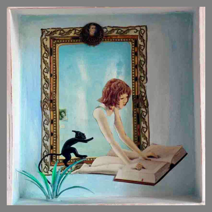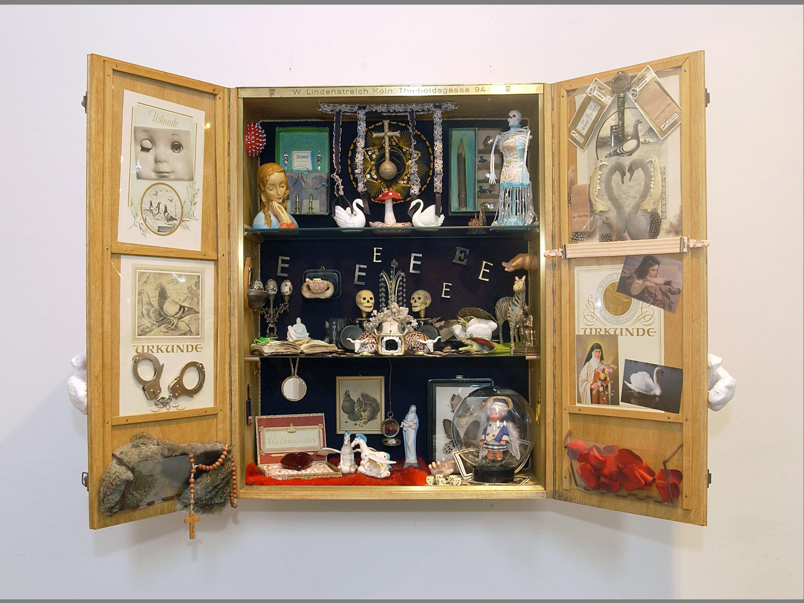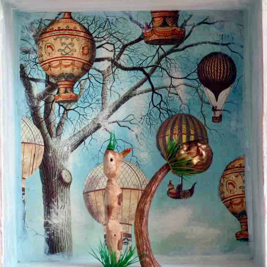 In den Kastenbildern finden Spielzeugfiguren, Phantasiewesen, Puppen, Skelette, Kinderstubenkleinkram, ergänzt um natürliche und künstliche Fundstücke wie Muscheln, Glassteine, Spiegel und Druckerzeugnisse eine neue Bestimmung.