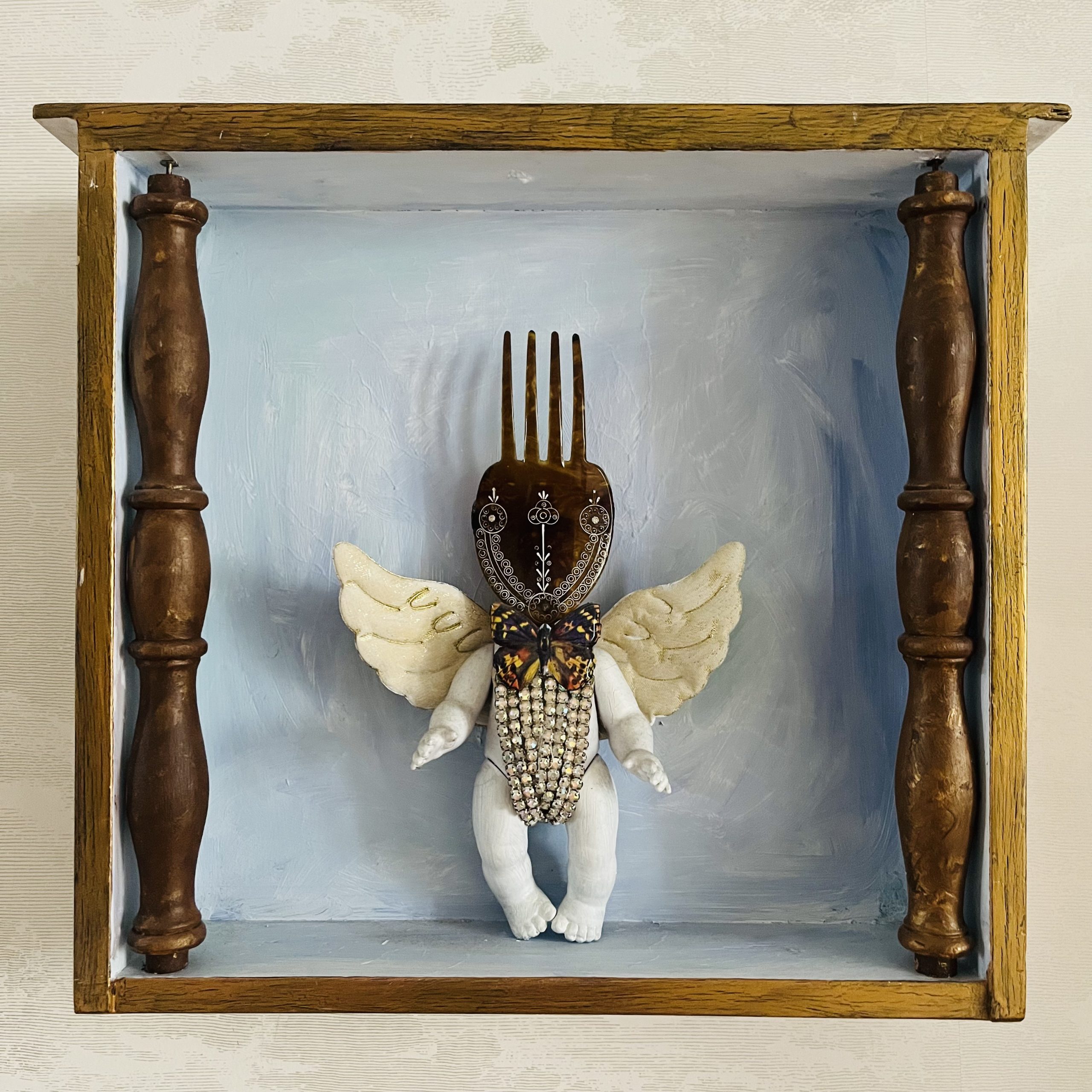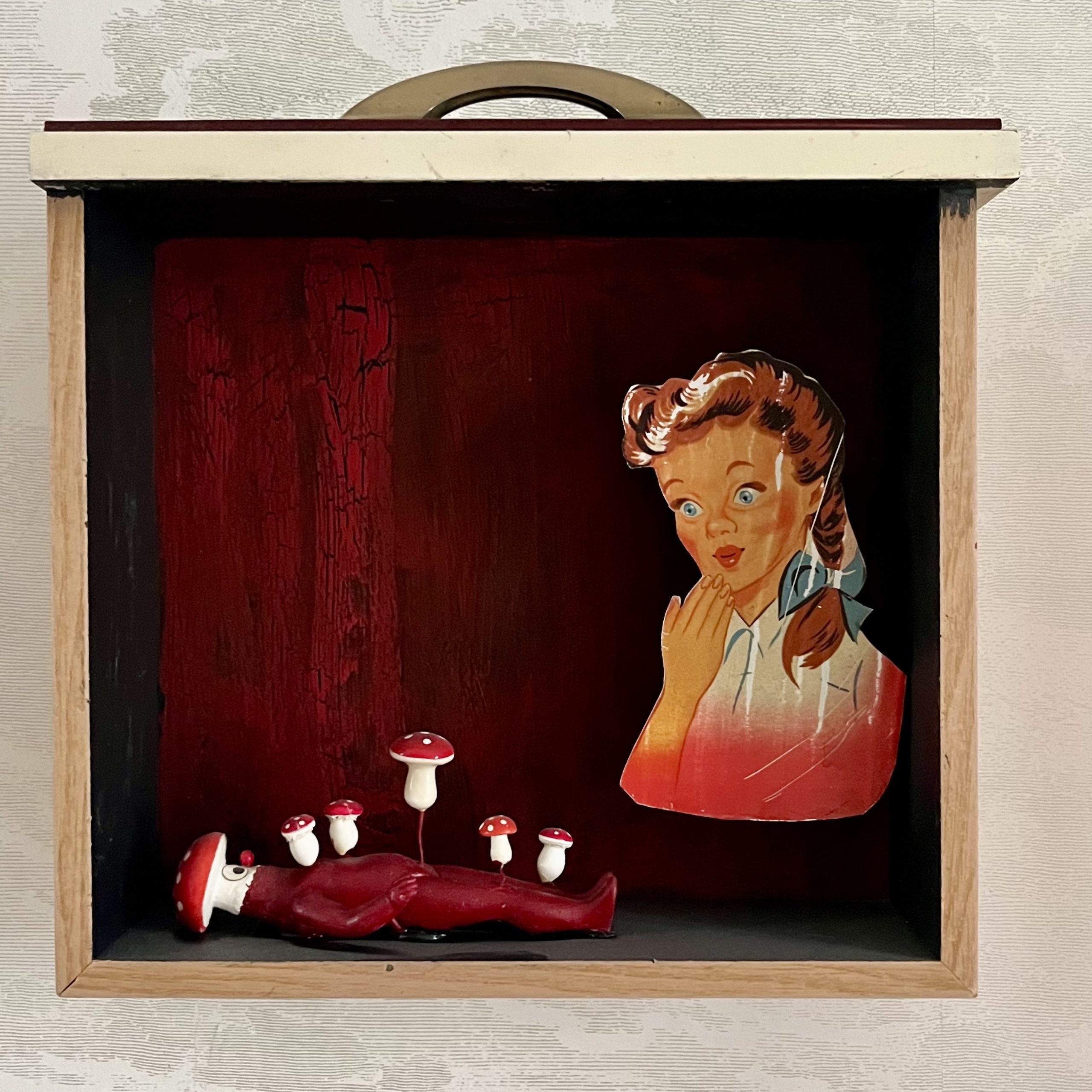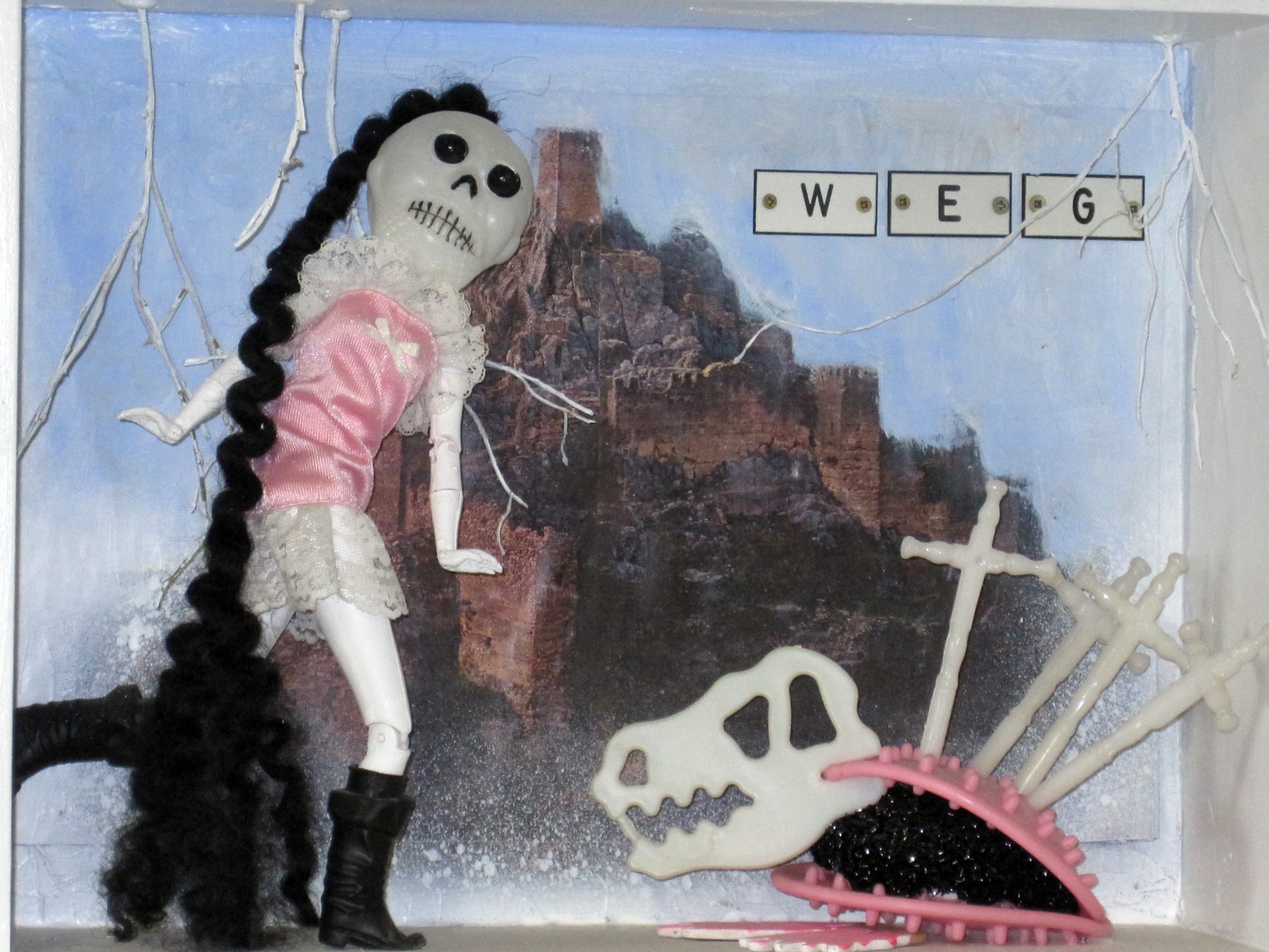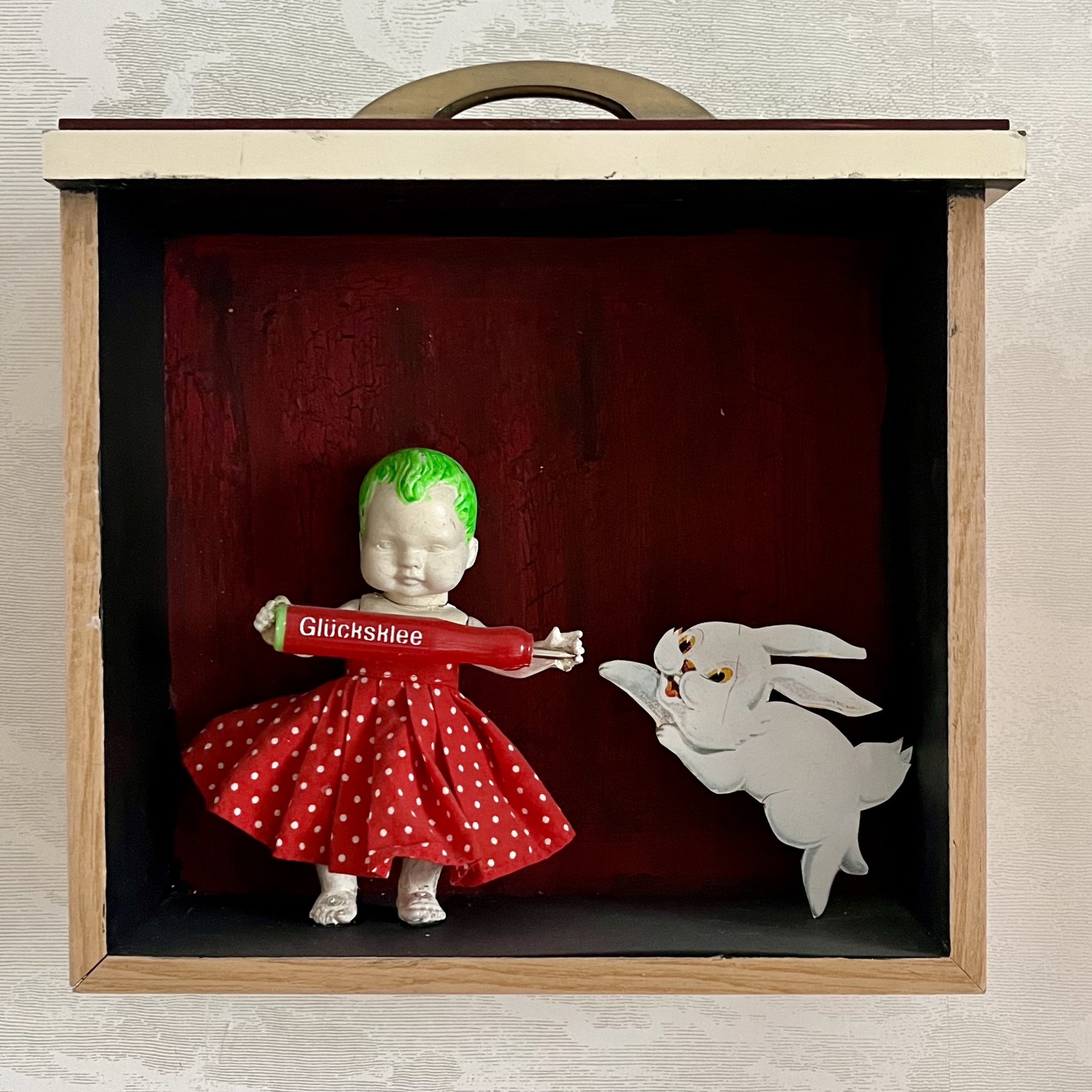 In den Kastenbildern finden Spielzeugfiguren, Phantasiewesen, Puppen, Skelette, Kinderstubenkleinkram, ergänzt um natürliche und künstliche Fundstücke wie Muscheln, Glassteine, Spiegel und Druckerzeugnisse eine neue Bestimmung.