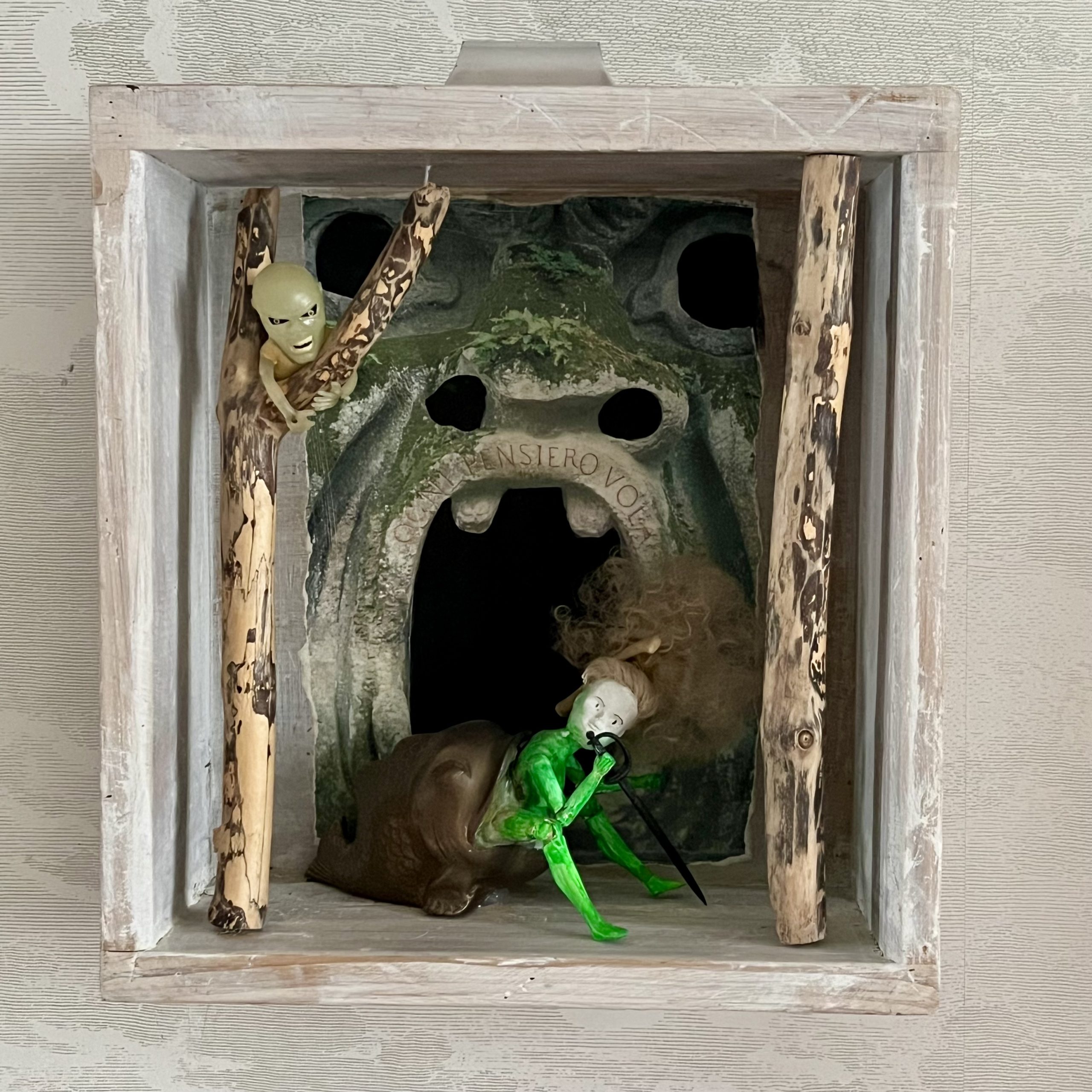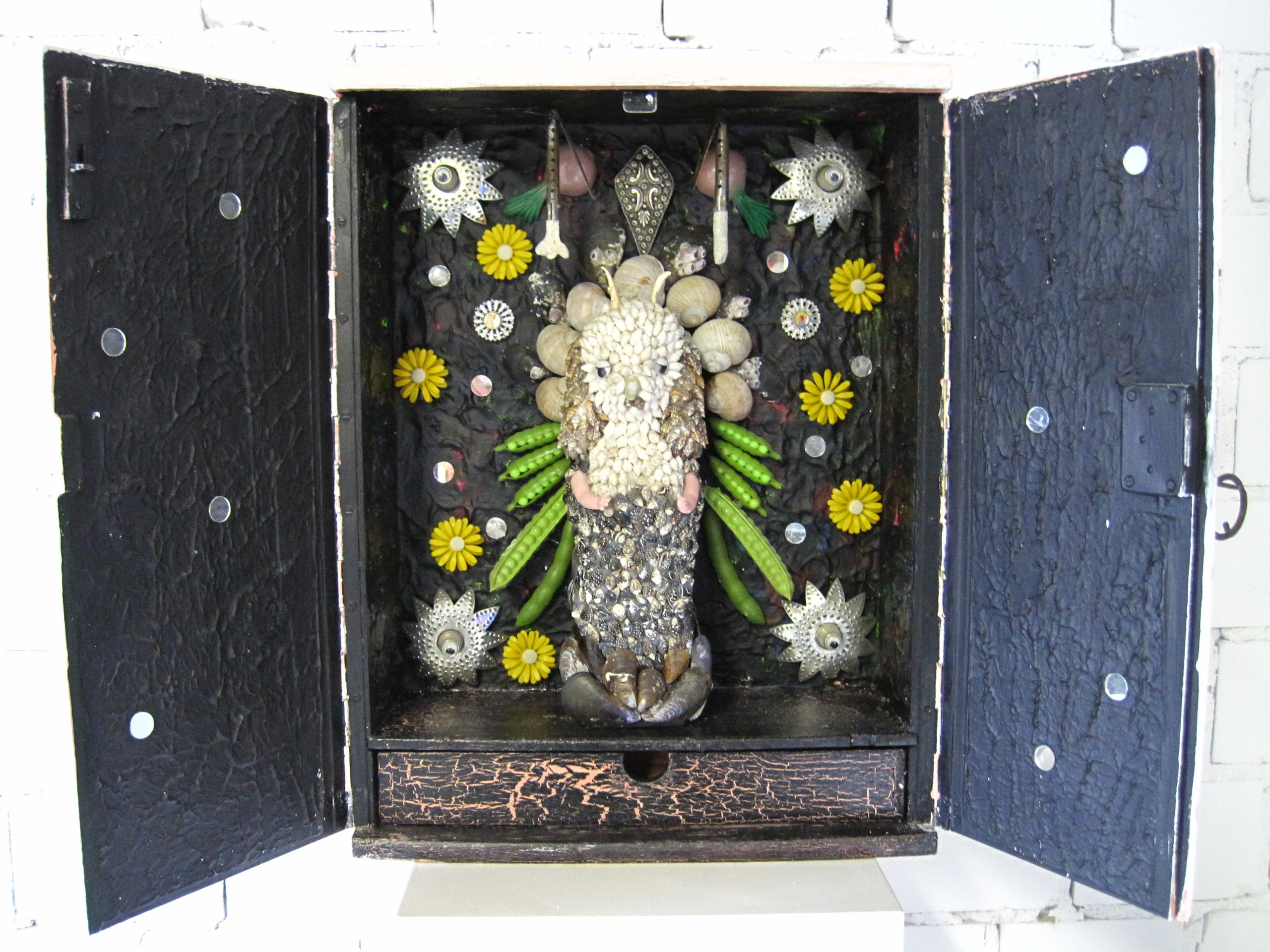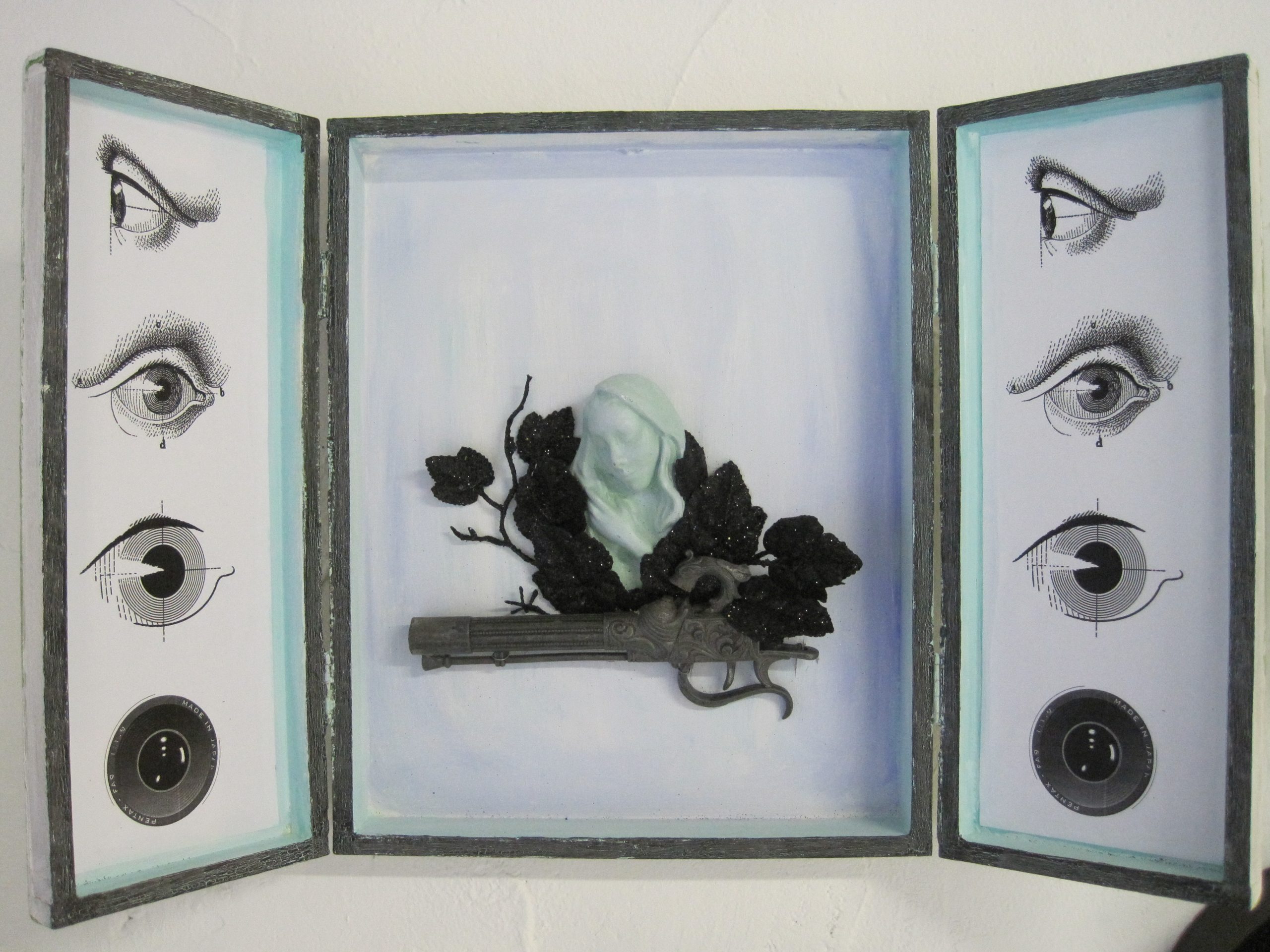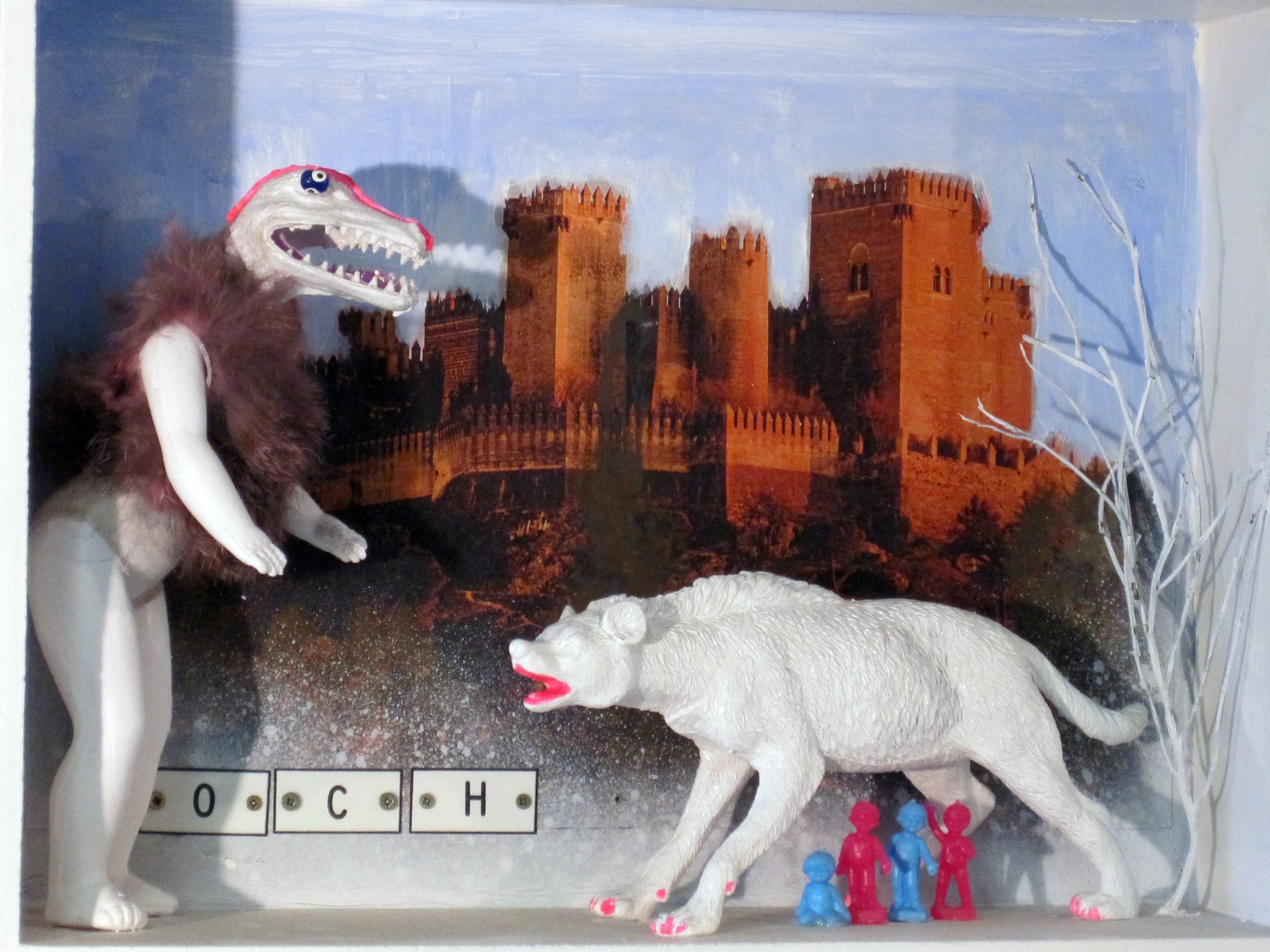 In den Kastenbildern finden Spielzeugfiguren, Phantasiewesen, Puppen, Skelette, Kinderstubenkleinkram, ergänzt um natürliche und künstliche Fundstücke wie Muscheln, Glassteine, Spiegel und Druckerzeugnisse eine neue Bestimmung.